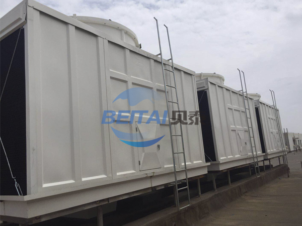 橫流式玻璃鋼冷卻塔內的填料采用兩面有凸點的點波片,通過安裝頭使點波片粘結成整體,以提高剛性,兩面的凸點還可避免直接滴水,因此提高了水膜形成能力,填料尾部設有收水措施。